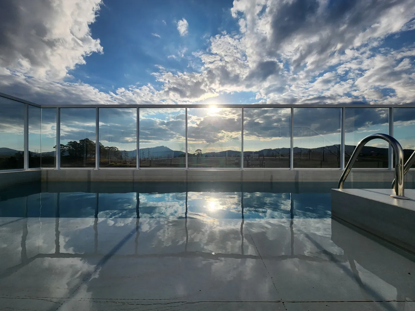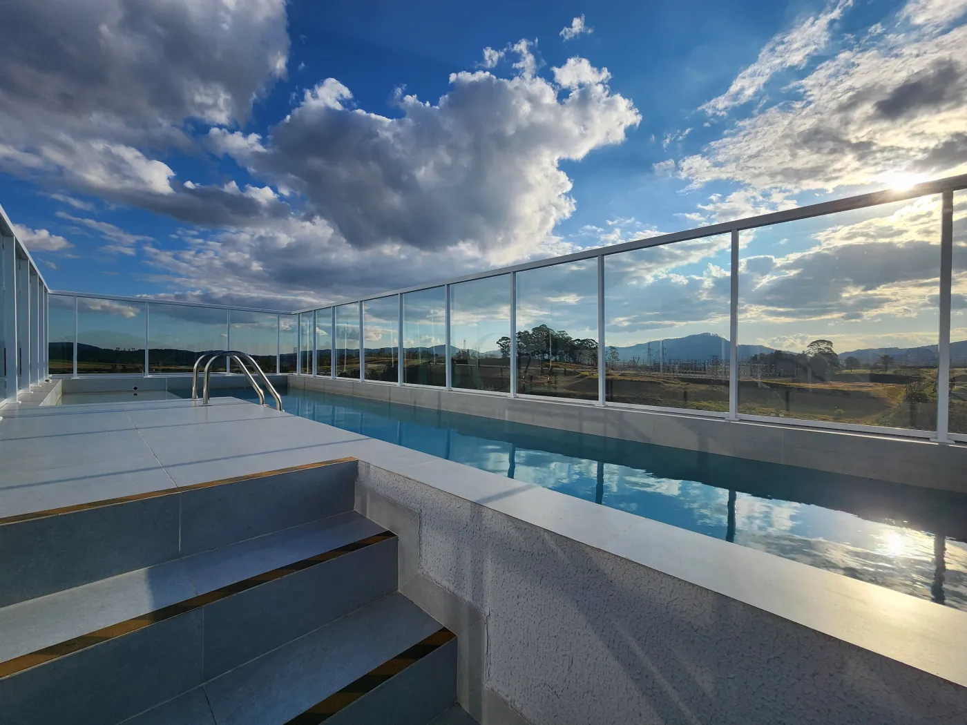 Piscina para adultos e crianças, com espreguiçadeiras e área de descanso;