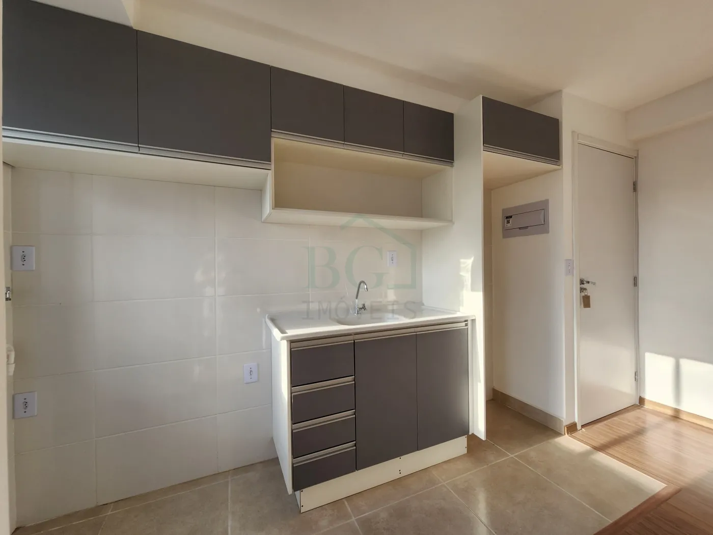 A cozinha planejada é moderna e funcional, equipada com armários embutidos e espaço para eletrodomésticos como geladeira, fogão e micro-ondas, garantindo praticidade no dia a dia.