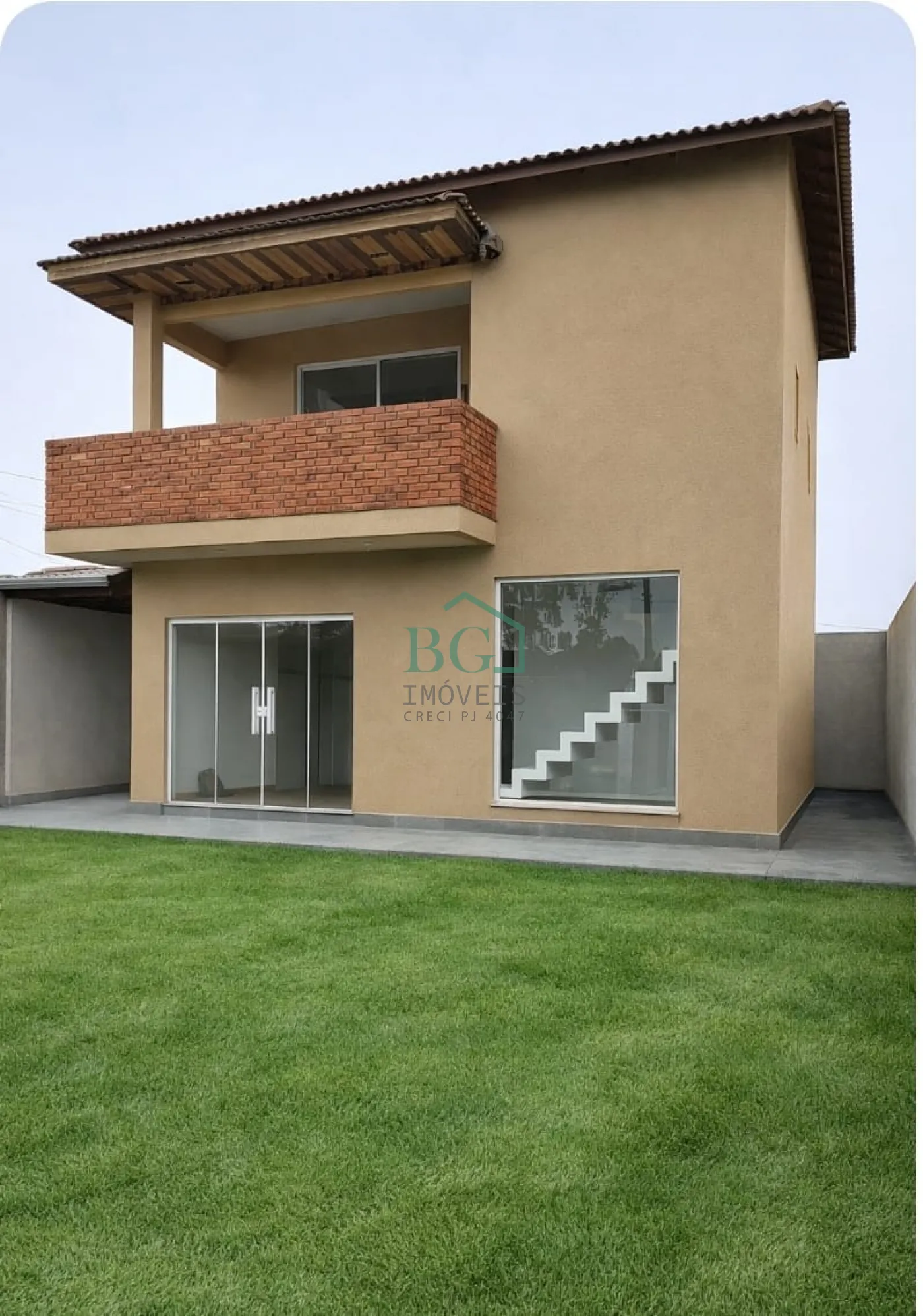 Na frente um quintal com espaço gramado que comporta uma piscina, uma área gourmet e garagem para 3 carros.
