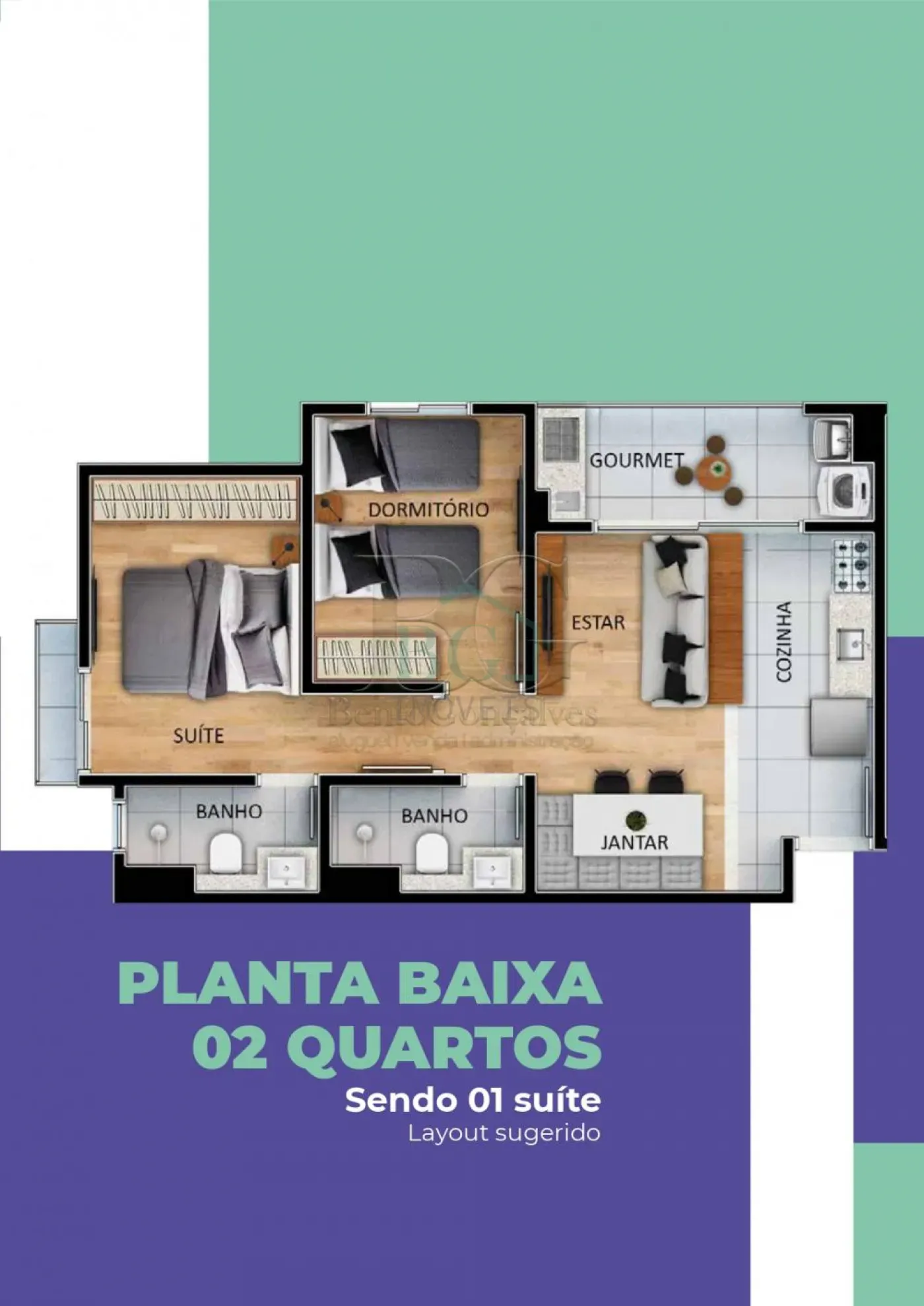 Apartamento com 2 dormitórios, sendo 1 suíte, sala, varanda gourmet, banheiro social, cozinha, área de serviço e garagem.