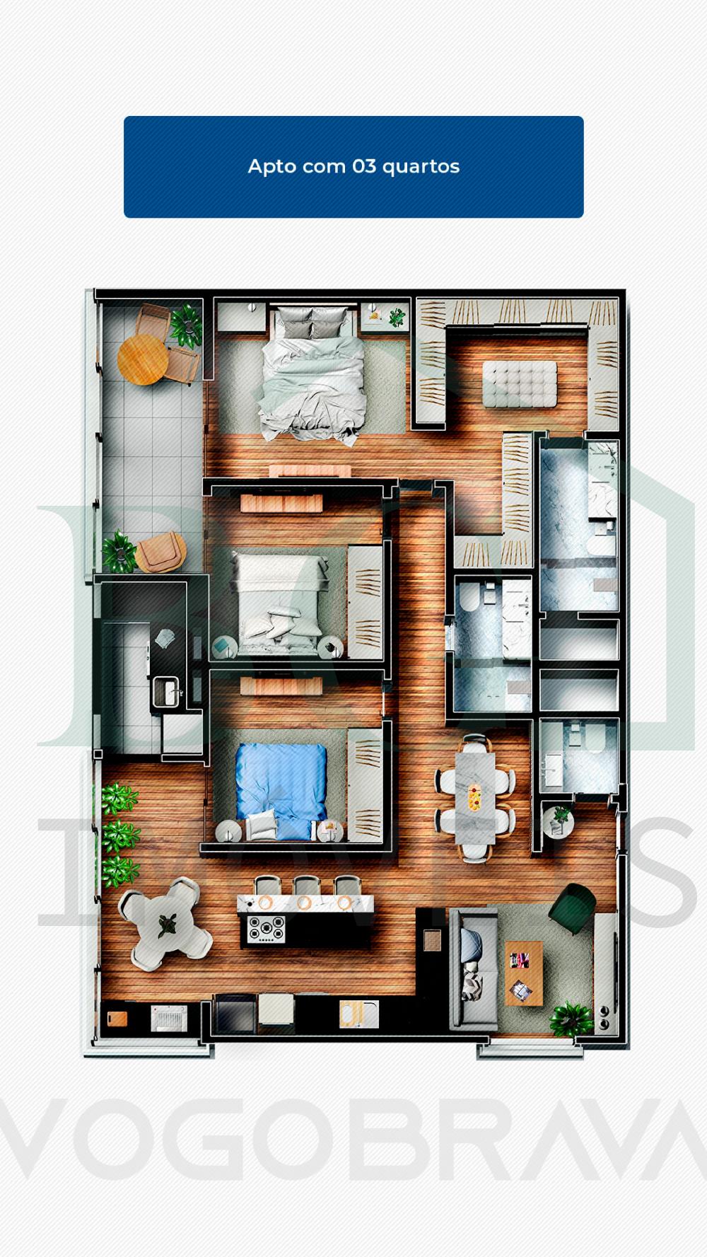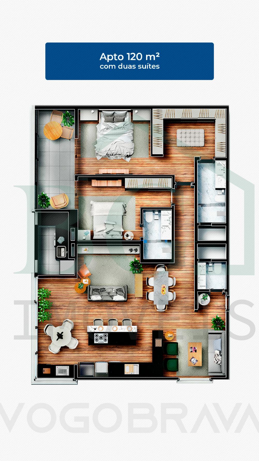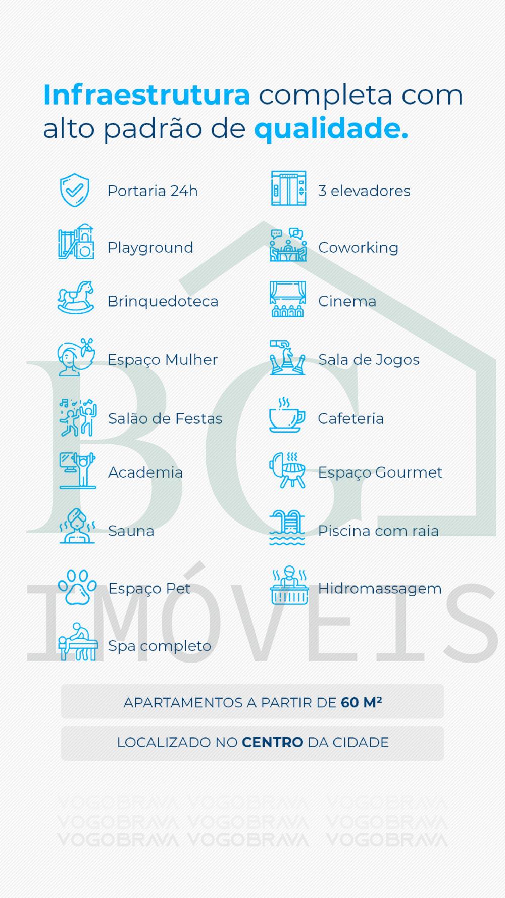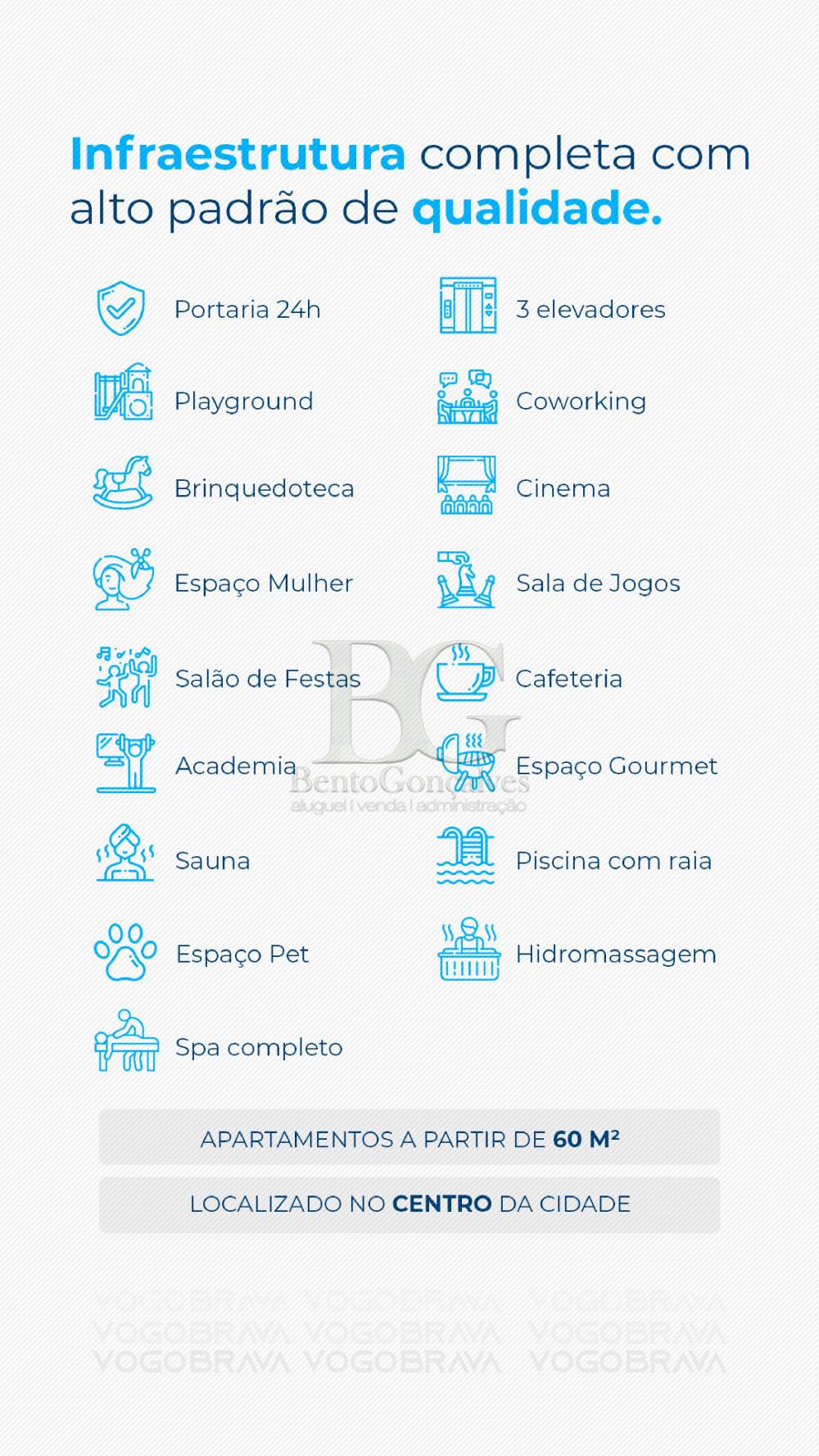 Apartamentos em módulos de 60m², possui sala, 1 suíte com closet, cozinha, lavabo, área de serviço e varanda gourmet.