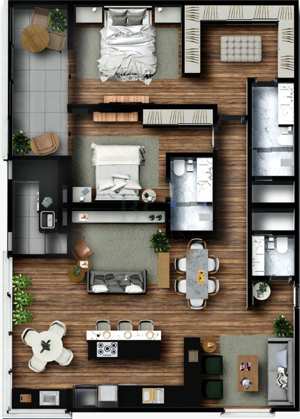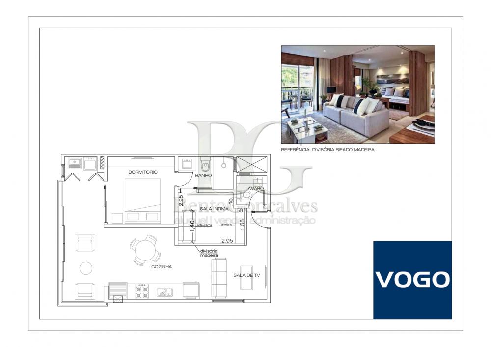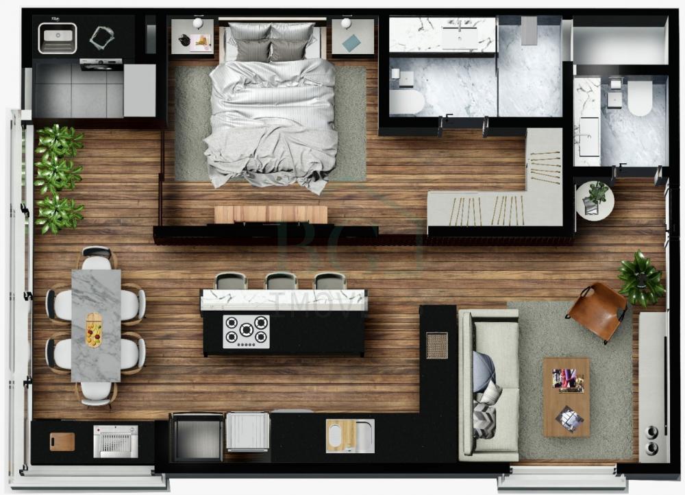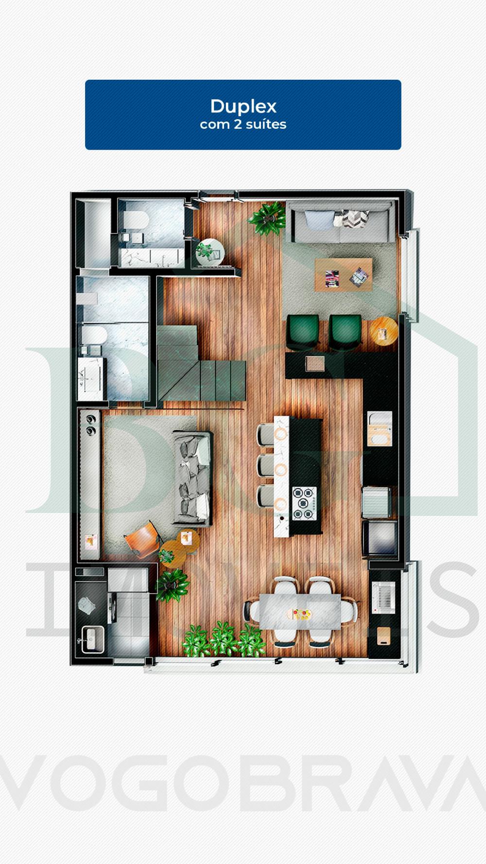 Apartamentos em módulos de 60m², possui sala, 1 suíte com closet, cozinha, lavabo, área de serviço e varanda gourmet.