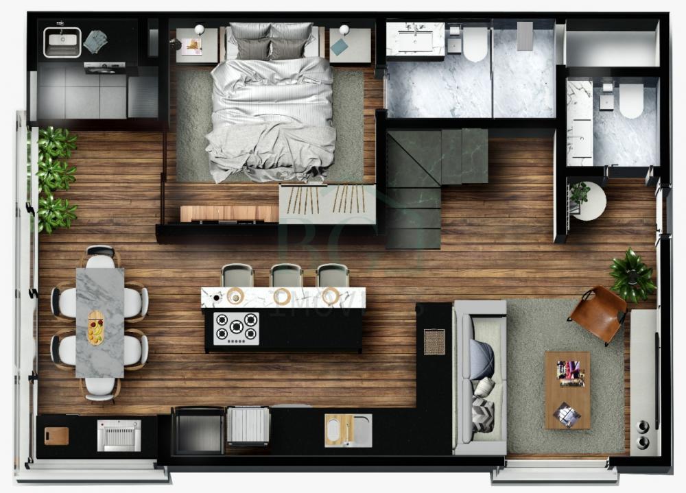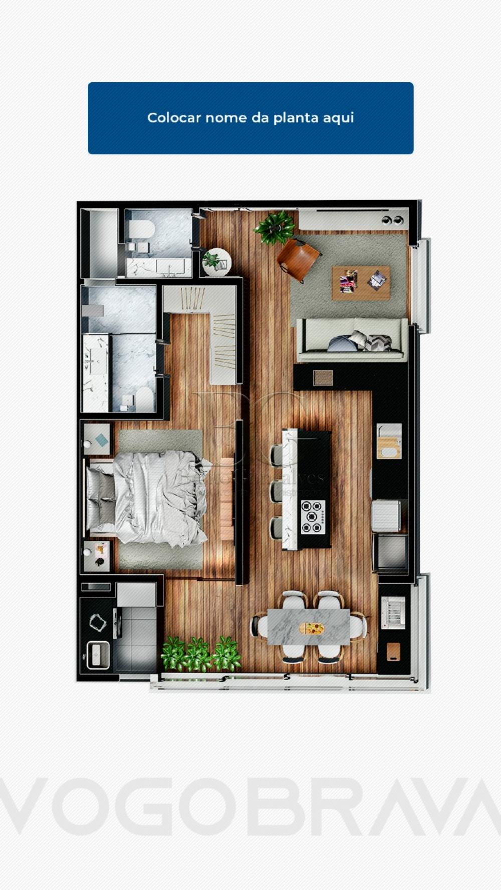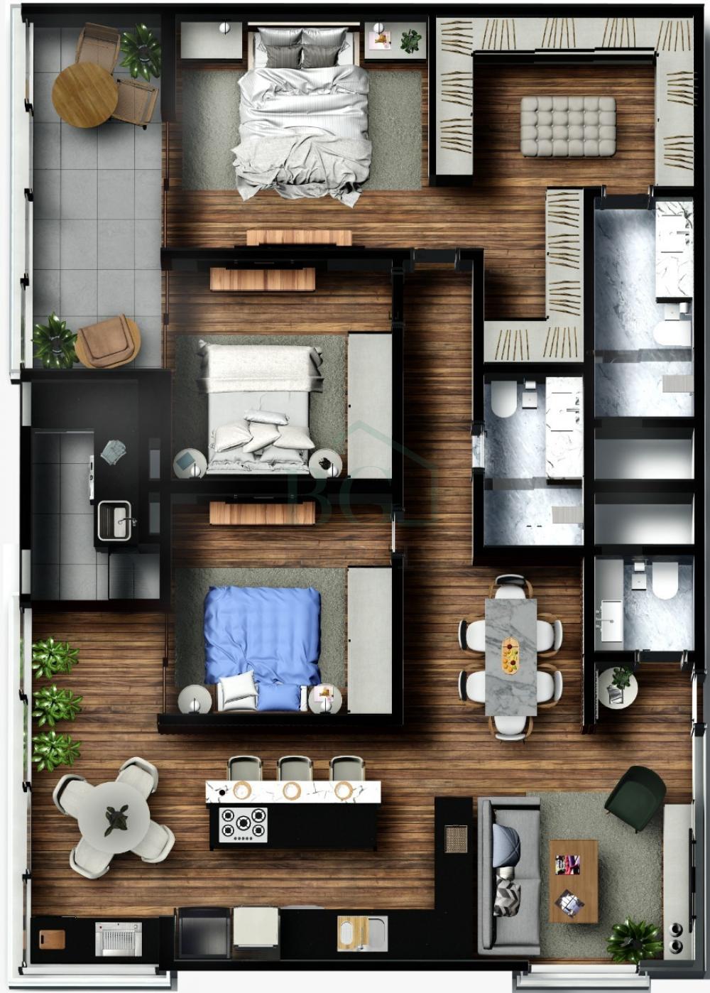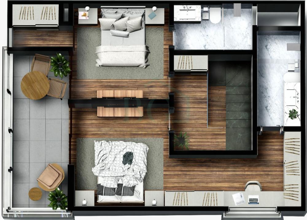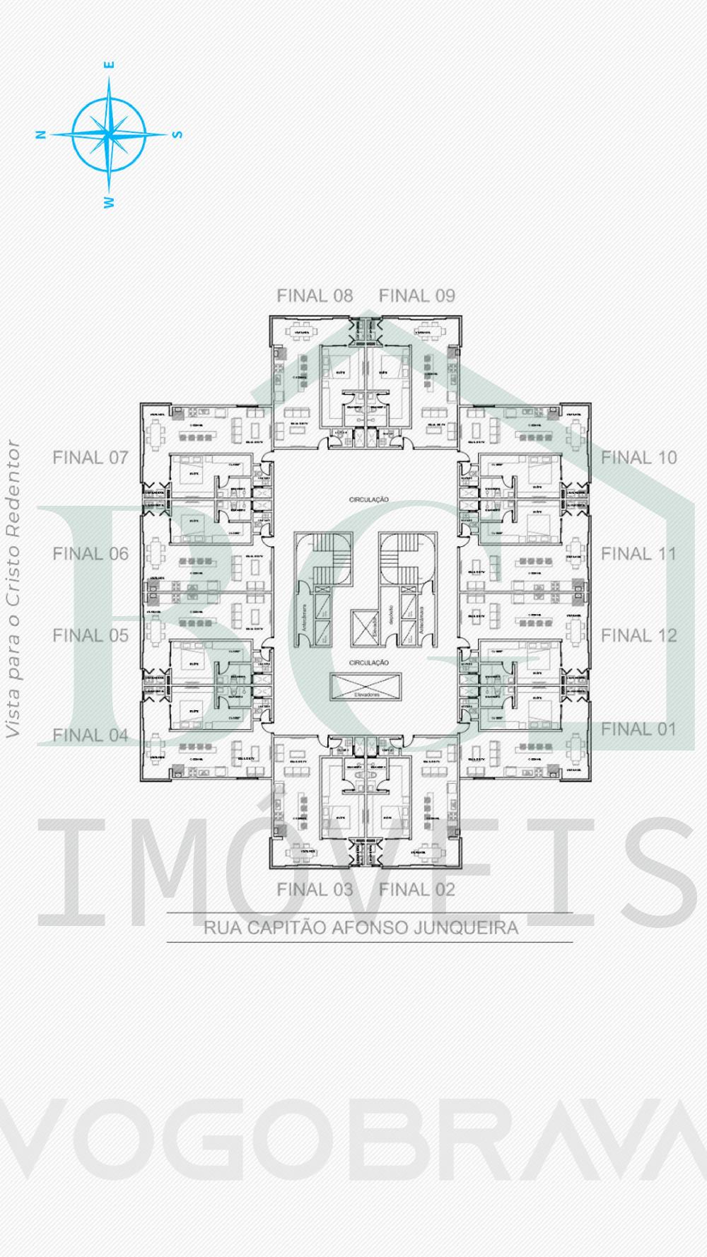 Apartamentos em módulos de 60m², possui sala, 1 suíte com closet, cozinha, lavabo, área de serviço e varanda gourmet.