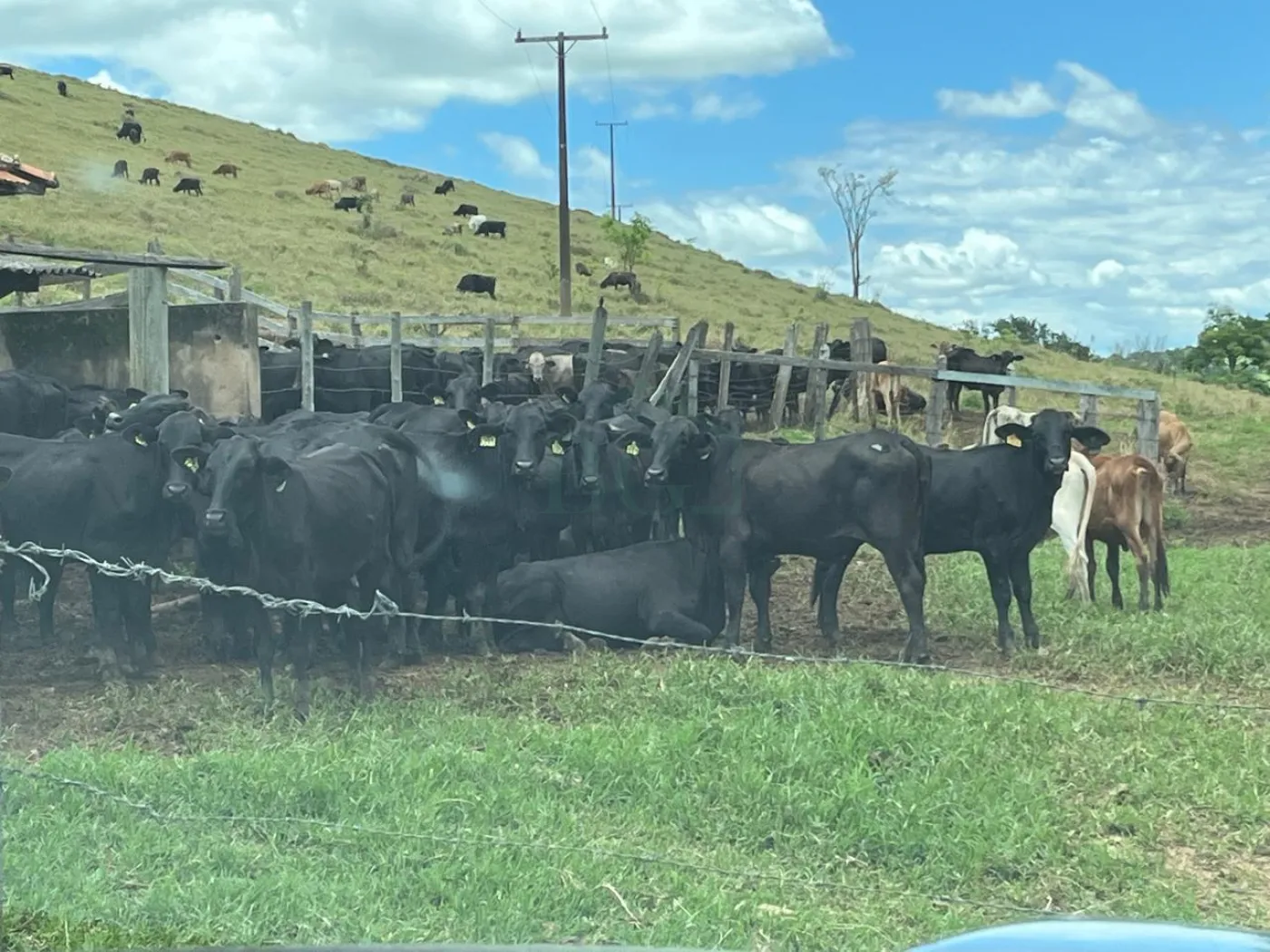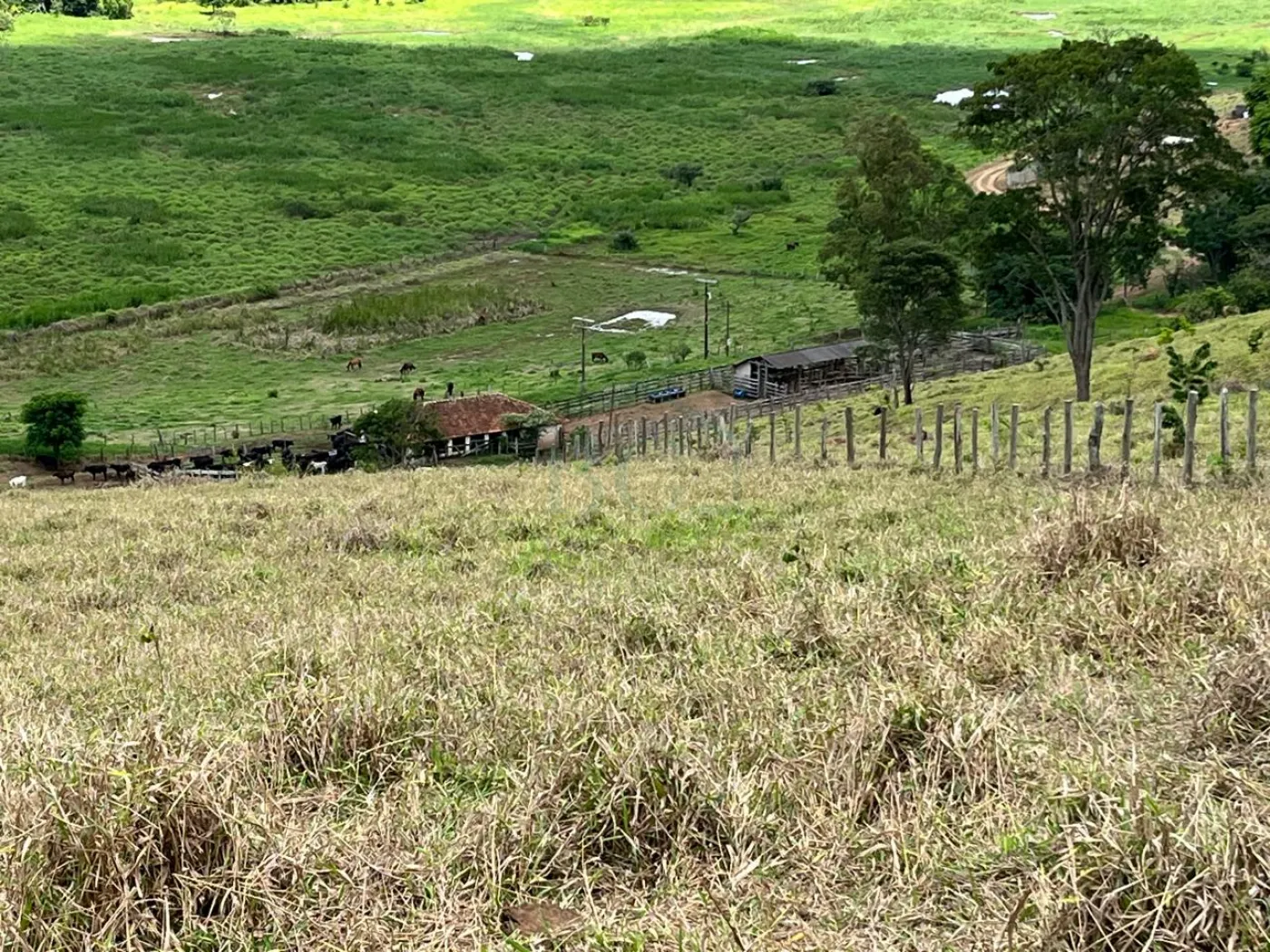 Fazenda voltada para gado, com casa de colono e estrutura para gado. Margeando o rio.